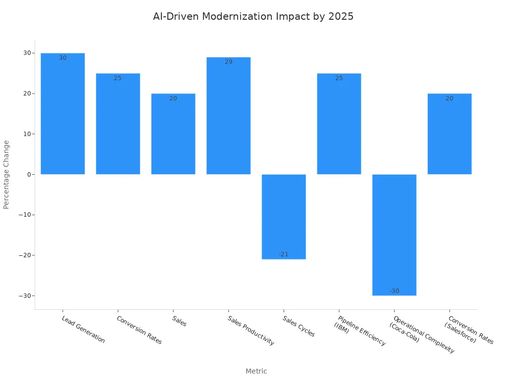 A bar chart showing projected percentage changes in various business metrics by 2025 due to AI-driven modernization. Positive bars indicate increases, and negative bars indicate reductions.