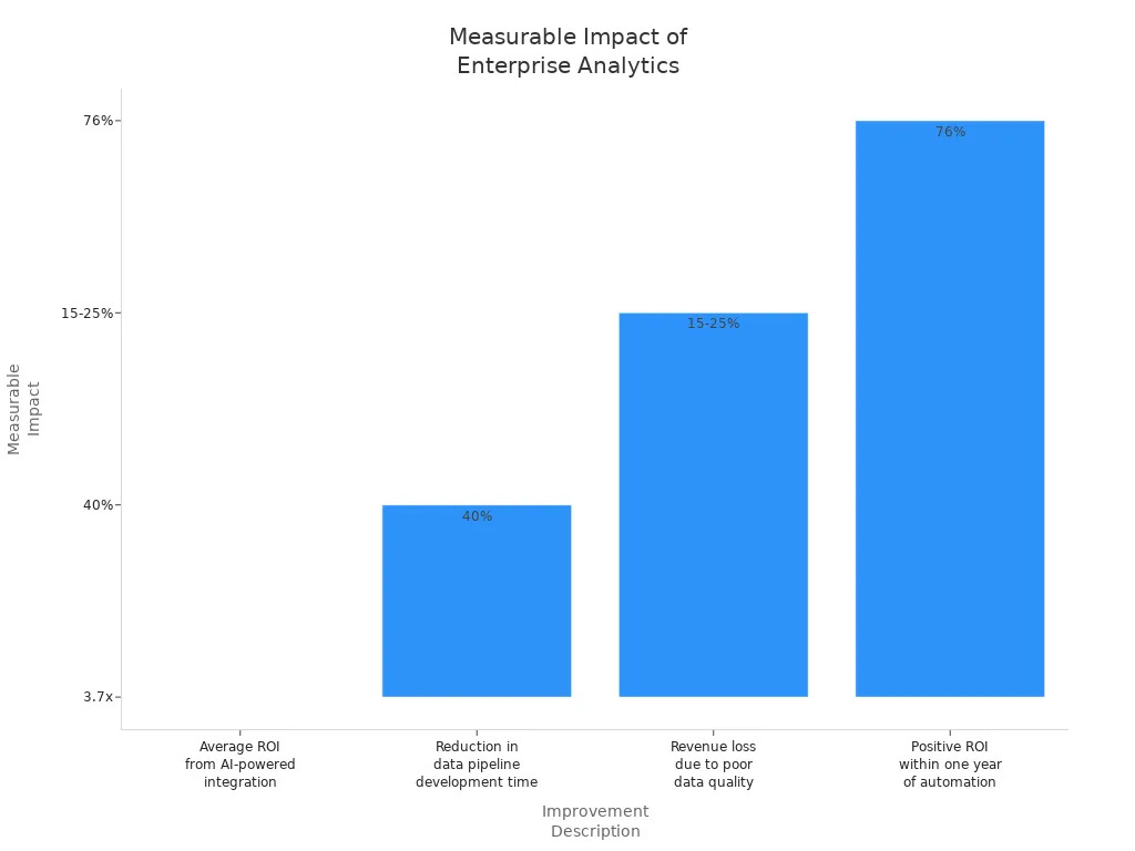 Organizations that use enterprise-scale analytics often notice real improvements. For example, they see an average ROI from AI-powered integration of 3.7x and a 40% drop in data pipeline development time. The table below shows some of these improvements: